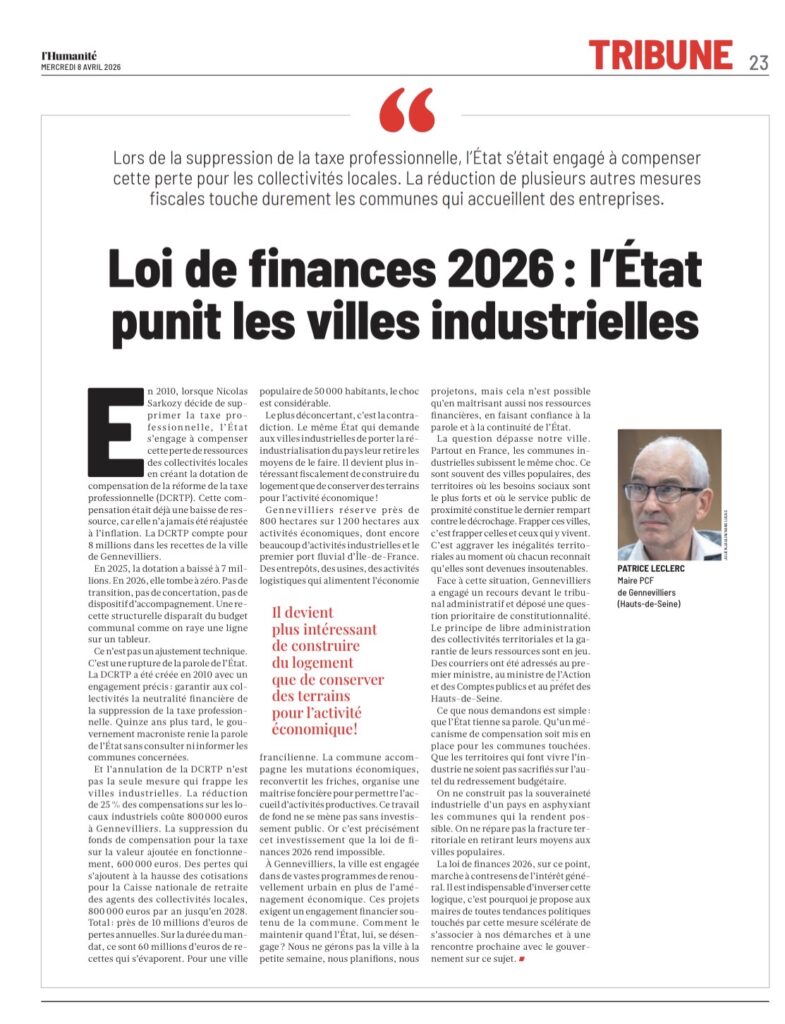 Tribune parue dans le journal l’Humanité le 8 avril 2026 https://www.humanite.fr/en-debat/budget/loi-de-finances-2026-letat-punit-les-villes-industrielles